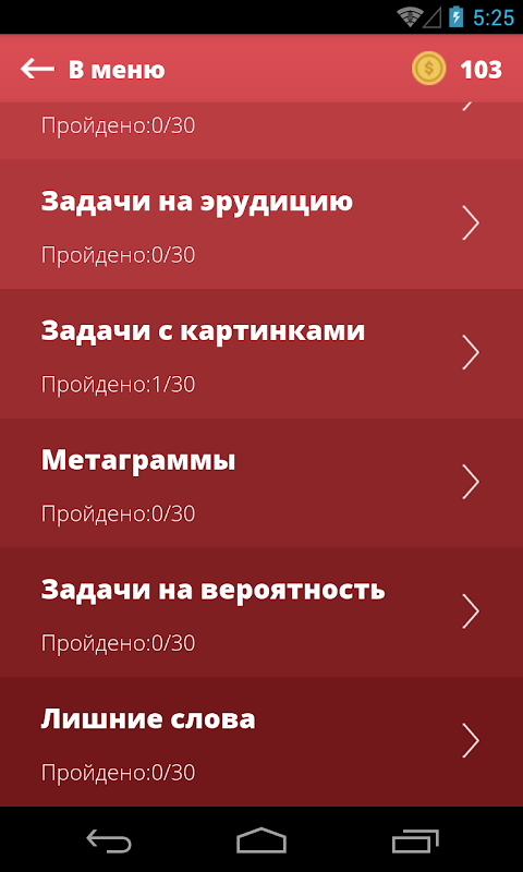 Versi terkini kini mempunyai 8 kategori dan 30 tugas dalam setiap! Dalam versi 2.0, anda tidak akan menemui masalah lama, pemaju telah menemui 240 masalah logik dan menarik yang terkini! Pada permulaan permainan 100 syiling diberikan untuk pemanasan! Tugas baru ditambah dari buku rujukan, laman web dan manual, yang memberikan permainan rasa yang benar-benar baru.