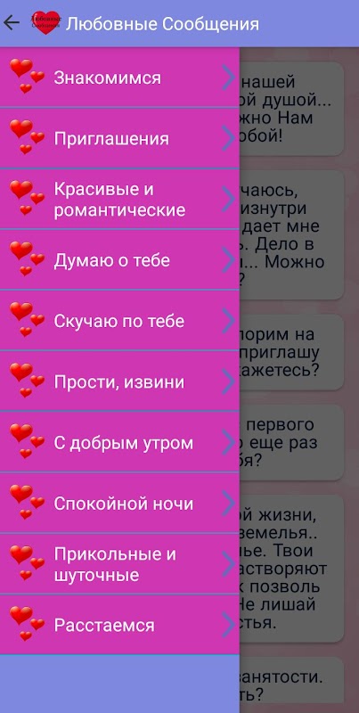 Любовные Сообщения - это лучший сборник любовных смс, состоящий из большого количества любовных сообщений, не требующий доступа к интернету. Теперь можно не ломать голову, придумывая оригинальное SMS. Данное приложение поможет признаться в любви дорогому Вам человеку, написать комплимент, рассказать о своих искренних чувствах любимым. Позволяет сразу из программы отправлять смс.
