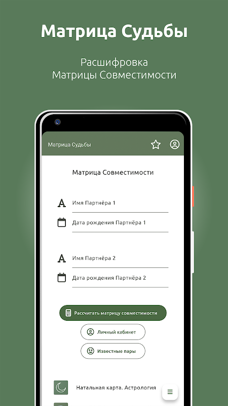 Matriks keserasian ialah penyahkodan nasib dua orang, yang menentukan sejauh mana mereka serasi antara satu sama lain dalam jangka masa panjang. Untuk mendapatkan matriks keserasian, aplikasi meminta data tentang dua orang: tarikh lahir mereka. Selepas itu, aplikasi mengira keserasian dua orang berdasarkan persamaan dan perbezaan nasib mereka.