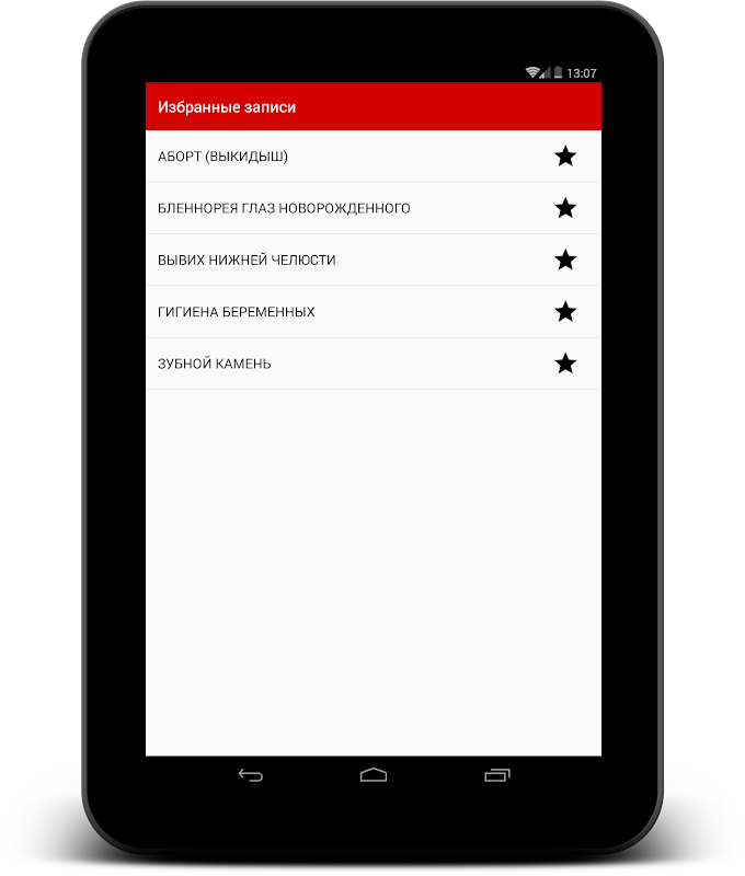 Hampir semua penyakit mempunyai sari kata, yang bergerak anda melalui menu intuitif memberikan anjakan jari ke kanan atau dengan klik pada butang di sudut kiri atas tetingkap.