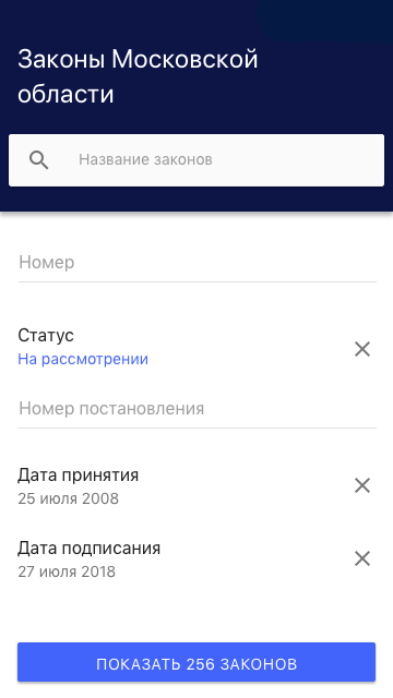 Fungsi aplikasi ini, dari segi pencarian, adalah serupa dengan perkhidmatan yang dilaksanakan di laman web rasmi Moscow Regional Duma.