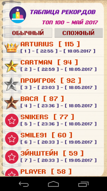 При достижении очередного личного рекорда, вы можете отправить данные в онлайн таблицу лучших игроков месяца.