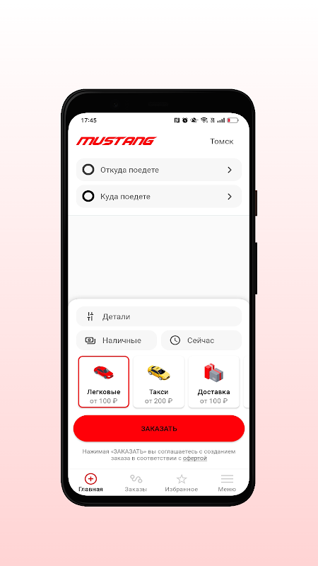 Kaedah ini menjimatkan masa anda dengan ketara dan mempercepatkan proses menghantar kereta! Selepas membuat pesanan, ia dipindahkan untuk dilaksanakan kepada rakan kongsi Perkhidmatan Pesanan Teksi Mustang. Menghantar pesanan melalui aplikasi Mustang bermakna bersetuju dengan syarat tawaran awam, yang boleh anda baca di laman web https://taxi.tomsk.ru