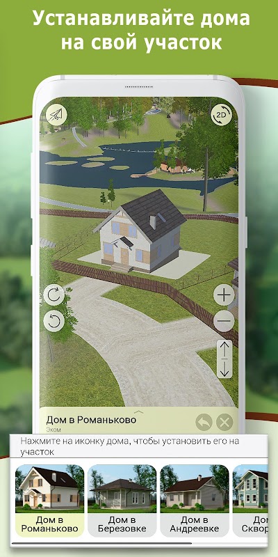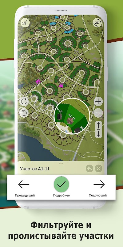 Pilih tapak pada pelan umum atau dengan penapis, menerima maklumat lengkap dan terkini. Tetapkan model rumah di tapak dan tentukan gaya seni bina suku anda.
