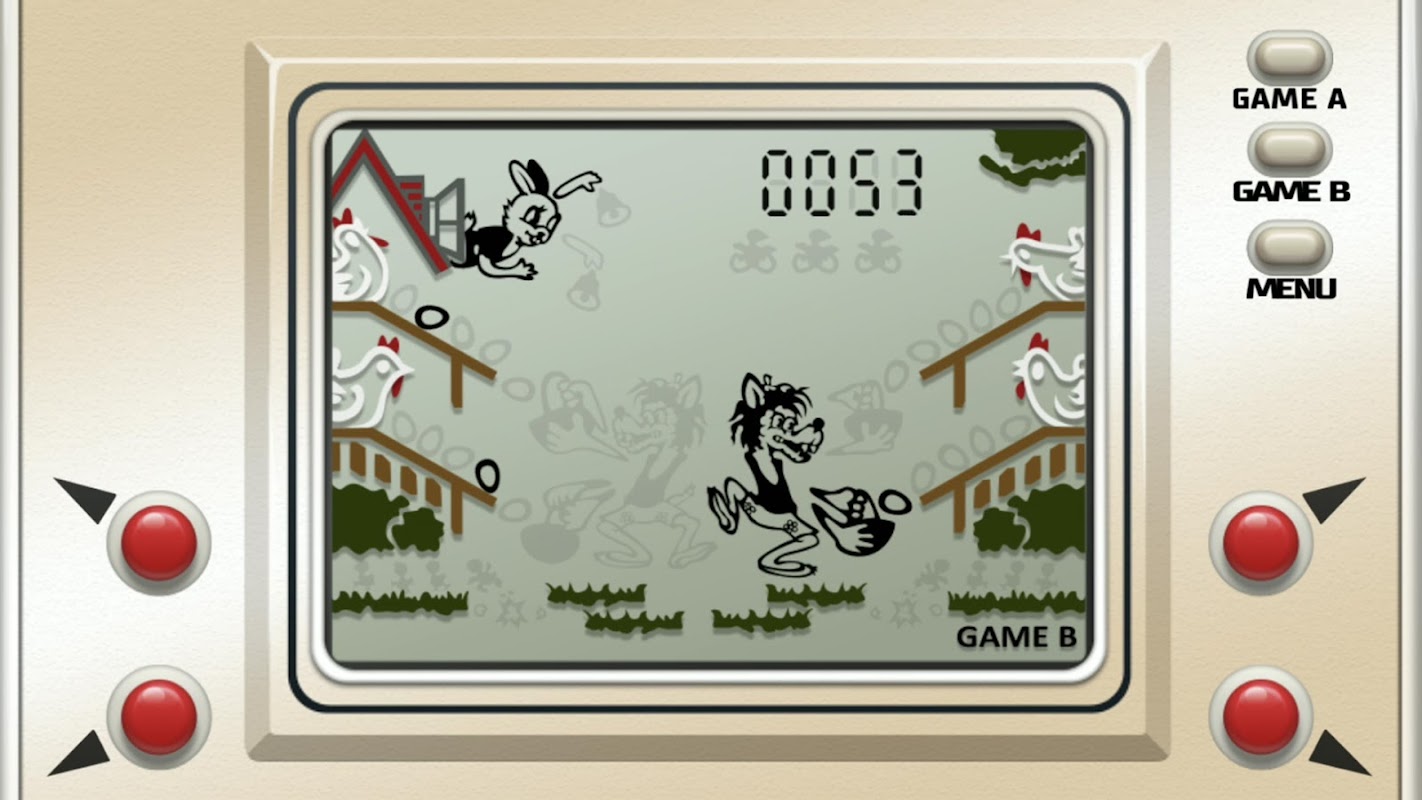 Permainan "Wolf on the Farm!" adalah sama mudah dan mudah seperti versi asalnya: empat ekor ayam duduk di atas perches, bertelur yang menggulung ke bawah empat palung condong. Dengan mengawal serigala, yang boleh mengambil empat kedudukan, matlamat anda adalah untuk menangkap sebanyak mungkin telur dalam bakul. Setiap telur yang ditangkap memberi anda satu mata. Pada mulanya, telur jatuh perlahan-lahan, tetapi secara beransur-ansur, rentak permainan semakin pantas.