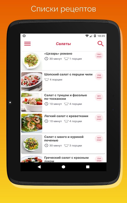 В приложении есть возможность создать или добавить понравившийся рецепт салата в список избранного для быстрого доступа.