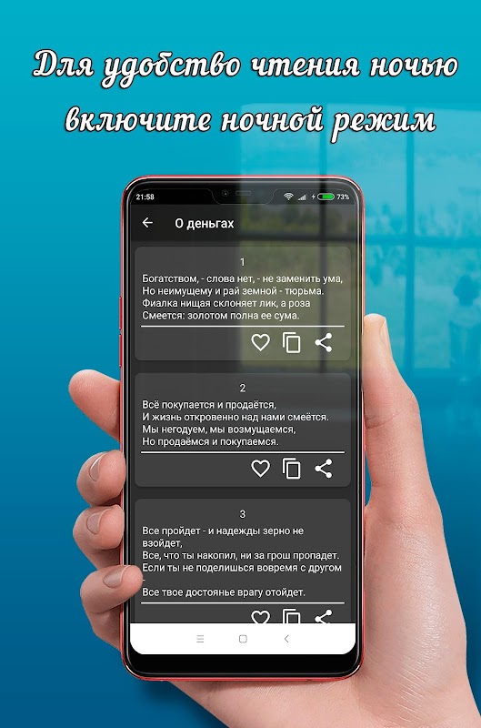 • Keupayaan untuk menyesuaikan aplikasi: mengubah saiz fon dan mod malam (mod malam diterapkan: pada subkategori, carian dan kegemaran).