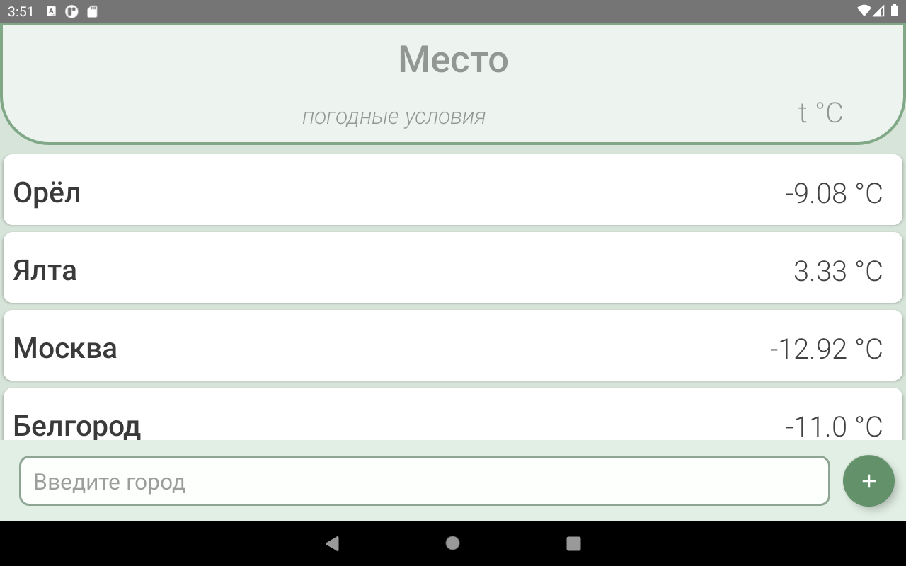 * Pada yang utama, anda boleh menentukan suhu semasa dengan serta-merta, mengikut lokasi semasa. Menggunakan carian, memasukkan nama bandar atau mana-mana penempatan dalam medan di bawah, anda boleh menambahkannya pada kegemaran anda dan sentiasa mengetahui cuaca semasa.