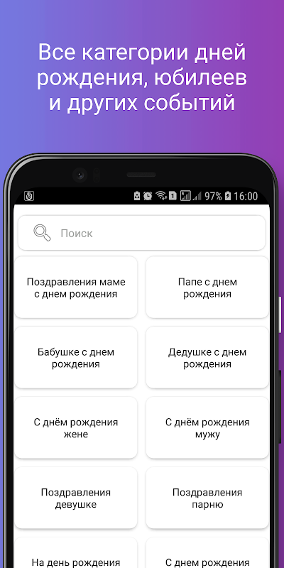 Чтобы это событие и праздник остались в памяти надолго, в нашем приложении представлены поздравления на все случаи и поводу, оно поможет найти лучшие слова для дорогих вам людей вовремя любого праздника.