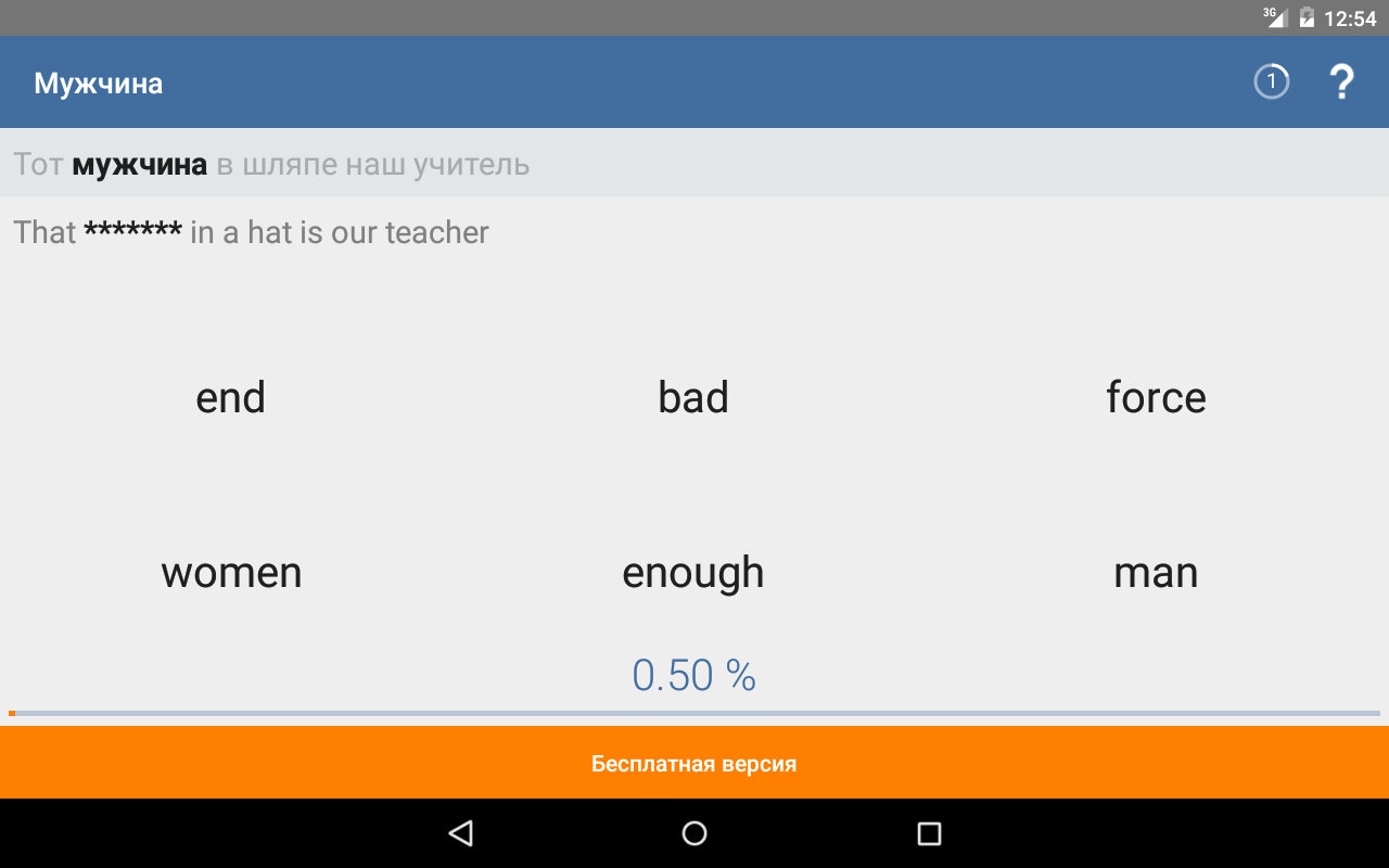 Jika anda menjawab dengan betul, program ini akan bersyukur kepada-Mu. Jika anda tiba-tiba membuat kesilapan - akan memberitahu jawapan yang betul dan akan menunjukkan kad perkataan.
