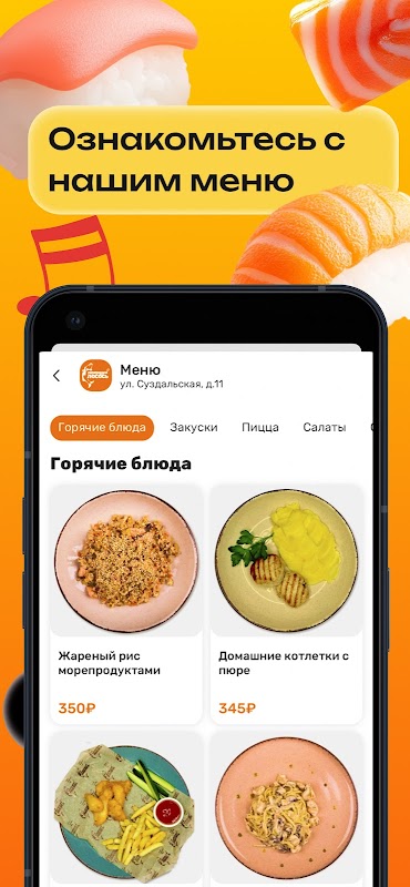 Permohonan kami adalah cara paling mudah untuk menggembirakan diri anda dan orang yang anda sayangi dengan hidangan lazat kegemaran anda. Dalam menu kami semua orang akan menemui sesuatu yang mereka suka: pizza dan pasta, kebab, sushi dan gulung, salad, sup dan banyak lagi. Kami memantau dengan teliti kualiti produk kami dan hanya menggunakan bahan-bahan segar dan semula jadi.