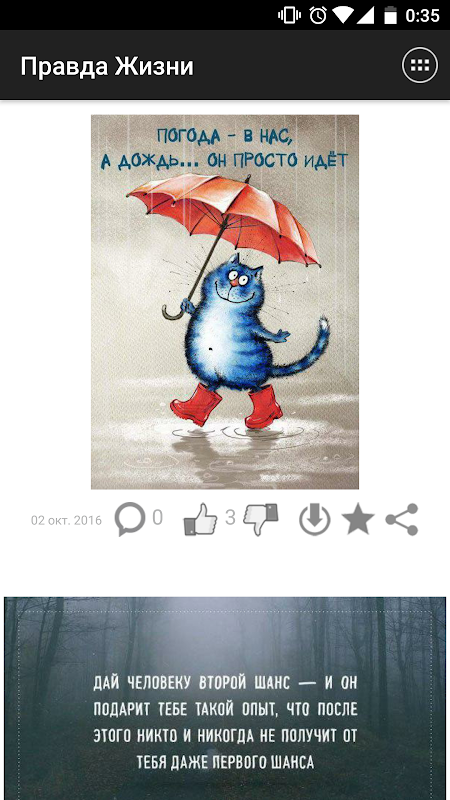 Правдивое и позитивное приложение о жизни! Смотреть ржачные приколы и интересные картинки со смешными цитатами. Позитивное приложение на каждый день с мотивационными картинками. Прикольные анекдоты с картинками, а так же новые приколы. Юмористические цитаты с иллюстрациями весёлых жизненных ситуаций. Как надо жить и позитивно относиться к жизни можно узнать у нас! Заряжайся позитивом из Правда Жизни! Ежедневные обновления!