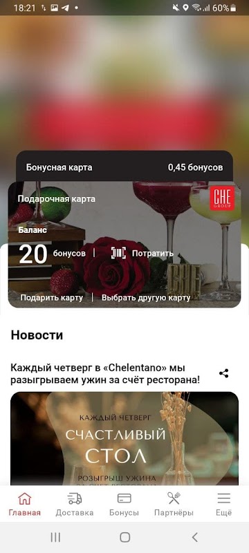 Бонусная программа «Привилегия» ресторанов «Chelentano», «Чабрец», «Che-Dor» и «Chang». Получите карту бесплатно, копите бонусы при каждом посещении и расплачивайтесь ими вместо денег! Ваша электронная карта всегда будет с вами!