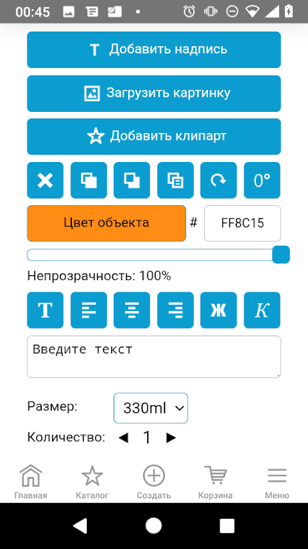Memuat naik imej dan foto, seni klip vektor, menambah inskripsi dalam warna dan fon yang berbeza, objek bergerak, menukar saiz, berputar. Untuk mug dan cawan, pratonton 3D telah dilaksanakan, membolehkan anda menilai reka bentuk cenderahati sehampir mungkin dengan sebenar.