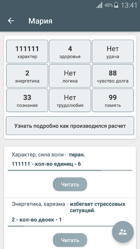 В приложении Психоматрица Пифагора Вы можете как рсчитать себя, так и сравнить двух людей и узнать что их объединяет и что их различат.