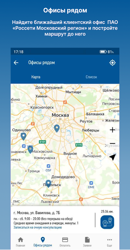 – Cari pejabat pelanggan terdekat PJSC Rosseti Wilayah Moscow dan bina laluan ke sana
