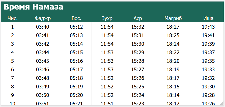Lampiran itu menunjukkan masa doa untuk daerah Kurakh