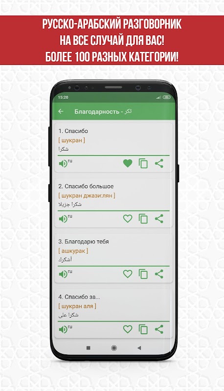 Приложение не только предоставляет доступ к большому и простому в обращении словарю, но и помогает научиться правильно читать арабский текст. В разговорнике вы сможете читать для начало из транскрипции и в дальнейшем сможете читать уже арабский текст. Именно этот подход для начало очень помогает новичкам.