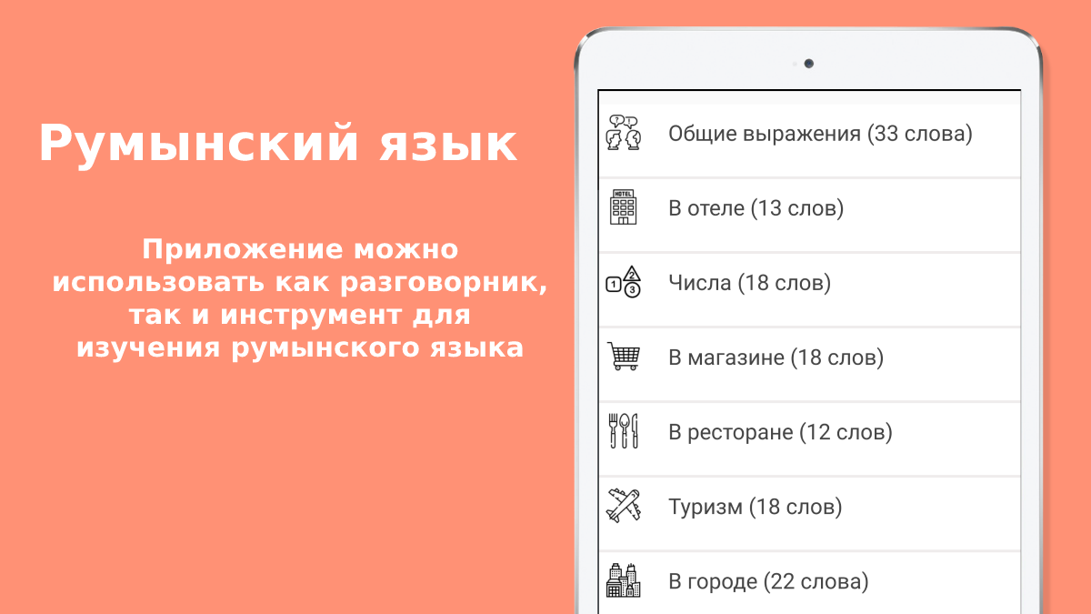 Русско-румынский разговорник можно использовать соответственно, как разговорник, так и инструмент для изучения румынского языка. Все румынские слова написаны русскими буквами и разбиты на 10 логических тем, то есть разговорник рассчитан на русскоговорящего пользователя (туриста).