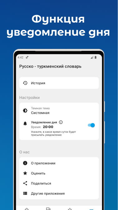 Terdapat fungsi carian untuk mencari perkataan yang anda perlukan dengan cepat dalam dua bahasa sekaligus. Anda tidak perlu memilih Rusia - Turkmen atau Turkmen - Rusia. Masukkan perkataan dalam carian dalam kedua-dua bahasa Rusia dan Turkmen.