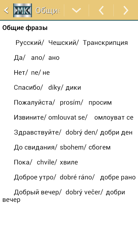 Русско-чешский разговорник. Предположим, вы приехали в другую страну и совершенно не владеете местным языком. Для того, чтобы проще общаться за рубежом и чувствовать себя как дома, предлагаем пролистать перед поездкой разговорник. В данном разговорнике вы найдете общие фразы и фразы на темы гостиница, магазин (покупки), транспорт, экстренные случаи, ресторан.