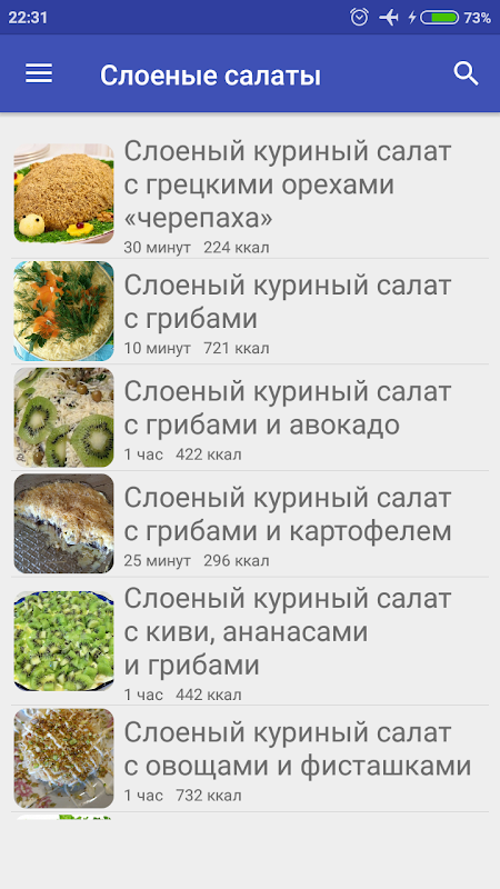 Слоеные салаты не только вкусное блюдо, но и украшение для любого стола. Суть слоеных салатов — в последовательном укладывании ингредиентов слоями. По составу они не сильно отличаются от традиционных овощных или мясных, разница только в технологии приготовления. Готовить слоеные салаты можно из любых ингредиентов, но лучше всего из ярких: ананаса, свеклы, моркови, помидоров, семги… Так повелось, что между слоями салаты промазывают майонезом или такими соусами, как тартар или соус дип. Важное условие — правильное сочетание цветов и вкусов. Слоеные салаты редко готовятся из свежих овощей, обычно продукты перед укладыванием варятся до готовности или обжариваются на масле. В блюде можно выигрышно использовать рыбные консервы или консервированные фрукты. Самый известный в России слоеный салат — сельдь под шубой — уже проверенный временем шедевр. Подают слоеные салаты в высокой прозрачной посуде, чтобы показать каждый отдельный слой. Сверху блюдо украшают зеленью, орехами, чипсами или крутонами.