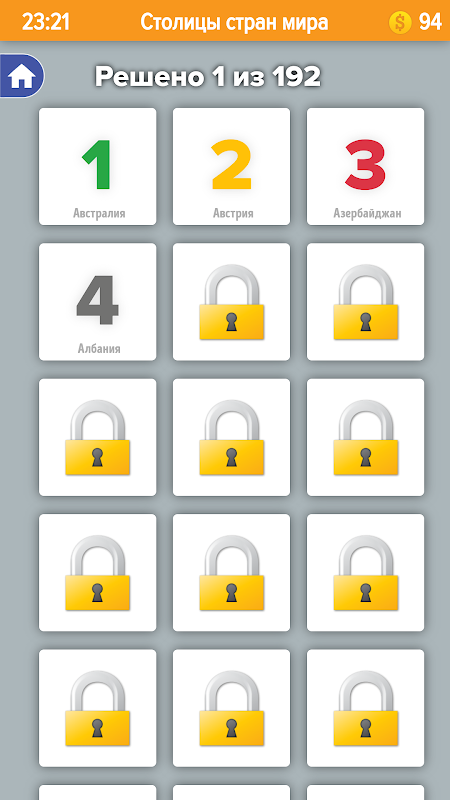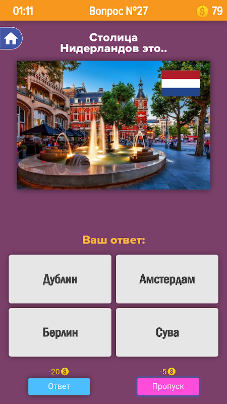 В этом приложении Вы сможете проверить и улучшить свои знания в области географии, а именно - столицы стран мира. Если Вы не знаете ответа на вопрос - его всегда можно пропустить кнопкой "Пропуск", а узнать правильный ответ при помощи кнопки "Ответ". За правильные ответы Вам будут начисляться поощрительные монетки, а за неверные - списываться. К пропущенным вопросам всегда можно будет вернуться позже.