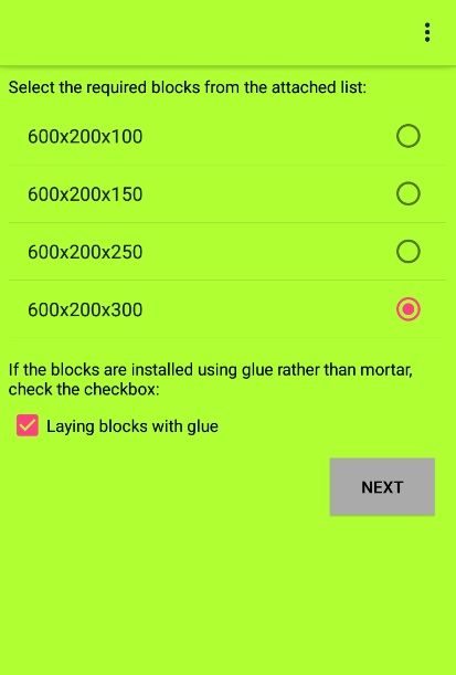 Ia adalah mungkin untuk menggunakan kedua-dua bata atau blok standard dan bukan standard. Pada masa yang sama, pelbagai kaedah meletakkan blok diambil kira: dengan gam atau dengan mortar simen. Dimensi tingkap, pintu dan bukaan lain dimasukkan dalam tetingkap aplikasi yang berasingan dan digunakan dalam pengiraan selanjutnya bahan.