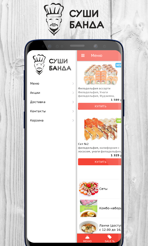 В меню разнообразие суши и роллов, горячая сочная пицца, вок с разными начинками, а также салаты и горячее. «Суши-банда» вкусно накормит всех! Скачайте наше мобильное приложение, заказывайте вкусные суши и пиццу, участвуйте в наших акциях и получайте скидки!