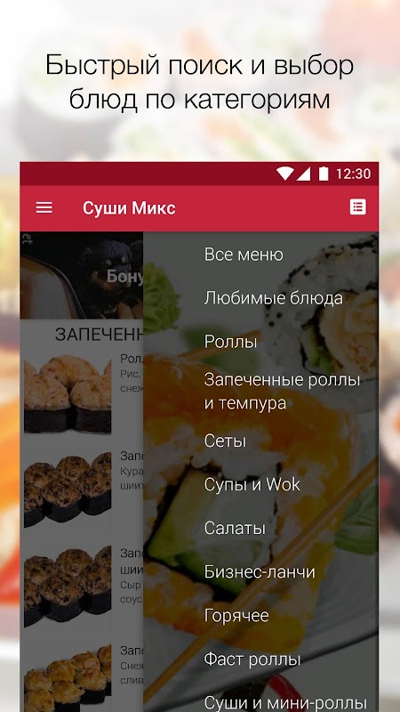 В специально составленном меню есть не только суши, но и WOK, супы, горячие блюда и даже бизнес-ланчи! Роллы, темпура, пицца и десерты – теперь это все на расстоянии клика!