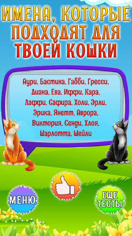 Любите разных животных,но котиков больше всех?Может у вас есть котик или вы планируете в будущем завести маленького котенка? Не знаете какое имя выбрать для вашего котика? Наш тест подскажет вам, как назвать вашего питомца или узнать какое имя ему подходит на самом деле! Правильное имя-это залог крепких отношений между вами и вашем питомцем!Он станет для вас лучшим другом и любовью на всю жизнь! Делитесь результатами теста с друзьями, пусть и они узнают какое имя подходит для их котика. Удачи!
