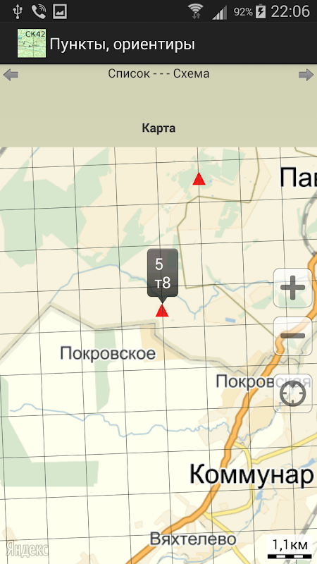 Apabila anda menyentuh peta, koordinat segiempat tepat (di SK-42) dan geodetik ditunjukkan.