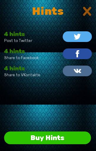 Если Вы совсем растерялись, то можно использовать подсказки, которые начисляются за прохождения уровней и постинг в соц.сетях. При необходимости их также можно приобрести в игровом магазине.