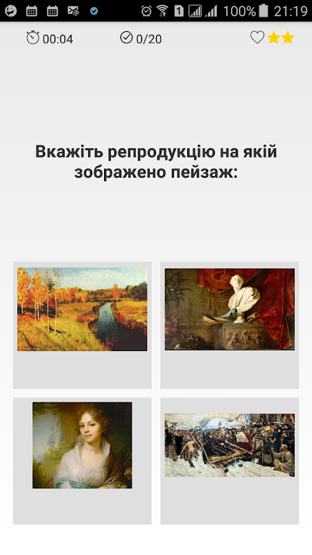 Ви зможете перевірити власні знання і визначити для себе чи добре Ви розумієтесь у шедеврах світового мистецтва. В процесі проходження тестів Ви отримуєте якісні знання з історії та теорії світової художньої культури. Навіть якщо Ви вибрали невірну відповідь Ви завжди зможете скористатись бонусною спробою і через декілька секунд Ви знову отримаєте можливість зробити свій вибір. Ви ознайомитесь з жанрами живопису: батальним, натюрмортом, портретом; шедеврами античної скульптури; з творами відомих грецьких драматургів; візантійськими базиліками; архітектурою Середньовіччя (романським та готичним стилями); живописом, музикою та модою Ренесансу, та багато іншим.