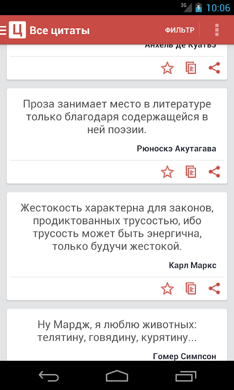 Anda boleh menghargai app "Petikan". Di sini anda akan menemui tanda kutip kegemaran orang-orang terkenal, ahli-ahli sains, artis, dan juga para pahlawan filem kegemaran anda dan kartun. Ini akan meluaskan pengalaman dan perbendaharaan kata saya.