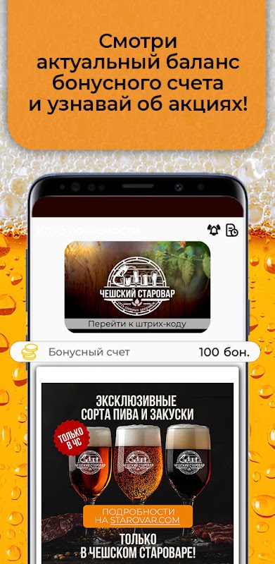 Apabila mendaftar dalam aplikasi, anda menjadi pemilik kad bonus maya, yang akan membolehkan anda mengumpul bonus dan membayar dengan mereka pada pembelian berikutnya dalam rangkaian Czech Starovar (ChS).
