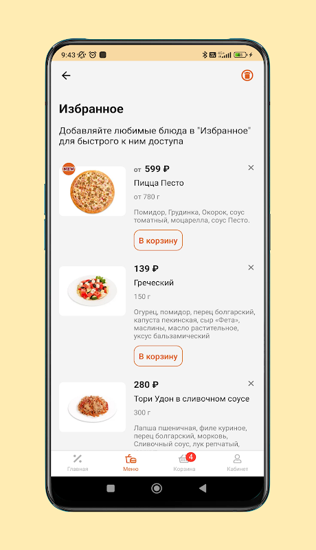 Permohonan mudah alih untuk pesanan makanan dari institusi Pizza Miracle (Kursk)