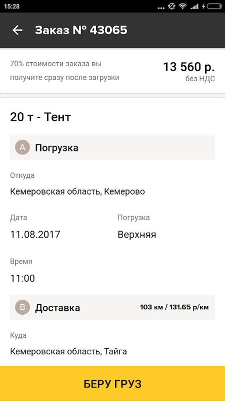 В приложении доступны загрузки для машин 20 тонн с типами кузова реф и изотерм.