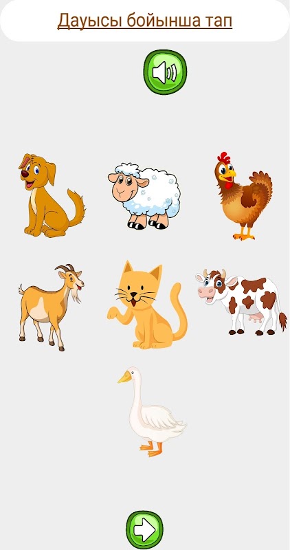 Dalam aplikasi Uy zhanuarlary, kanak-kanak itu berkenalan dengan imej dan bunyi haiwan peliharaan dan burung. Dalam bahasa Kazakhstan. Haiwan peliharaan.