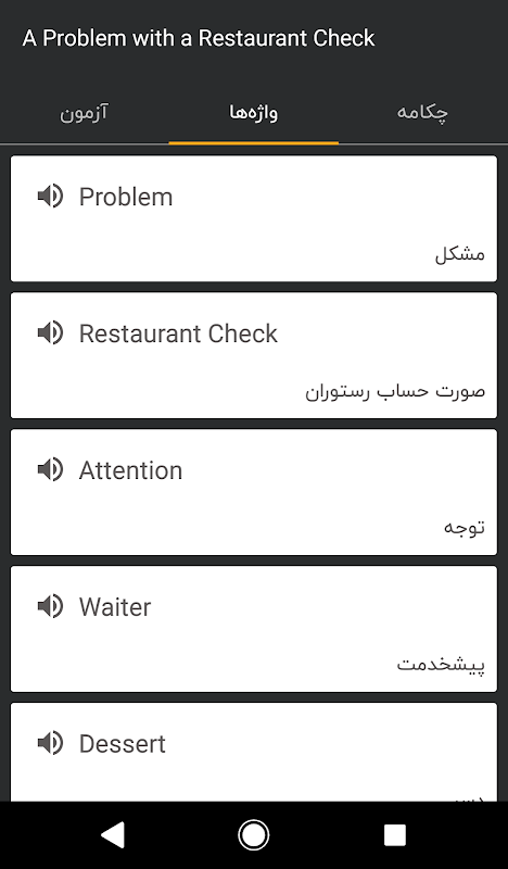 در قسمت مکالمه ی این نرم افزار شما می توانید خودتان را در شرایط مختلف داستان های ما قرار داده و با مکالمات مربوط به هر محیطی آشنا شوید و علاوه بر افزایش دایره واژگان خود، با ساختار جملات مختلف نیز آشنا بشوید و گوش خود را نیز به جملات مختلف آشنا کنید. اگر به دنبال بهترین نرم افزار آموزش زبان می گردید و علاقه به یادگیری زبان در کوتاهترین زمان دارید، اگر به تقویت زبان خود می اندیشید، جای درنگی برای نصب این برنامه نمی ماند.
