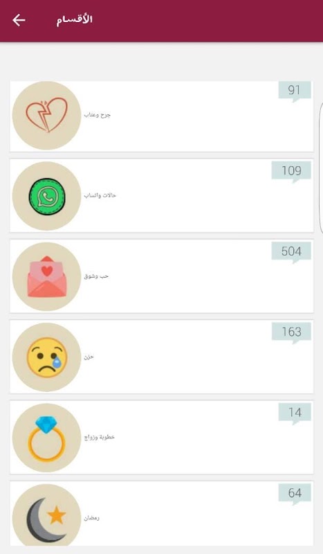 يضم التطبيق أيضا رسائل عن الأم ,مسجات عن الأم,اجمل رسائل الأم, اروع رسائل الأم, اجدد رسائل حب, احدث رسائل حب, احلى رسائل حب رسائل حب قصيرة اضافة الى احلى كلام غزل حب رومانسي عشق شعر و مسجات حب للرومانسيين كلام حب كلام رومانسي كلام غزل شعر حب قصيدة حب شعر الحب شعر رومانسي رومانسية خواطر غزل خواطر عشق رسائل الحب