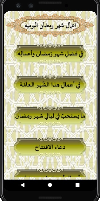 أعمال الاشهر رجب وشعبان ورمضان ويحتوي على اعمال الليالي والايام مقسمه ومفهرسه وكذالك الاعمال العامه والاعمال الخاصه ويحتوي الفهرس اعمال كل شهر وكل يوم وكل ليله وكذالك يتميز هذا التطبيق :