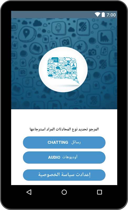 تطبيقنا هو للاسترجاع المحادثات بسهولة هو برنامج يندرج ضمن فئة multimédia وأيضا هو لا يحتاج إلى wi fi لأرساله في message apps .