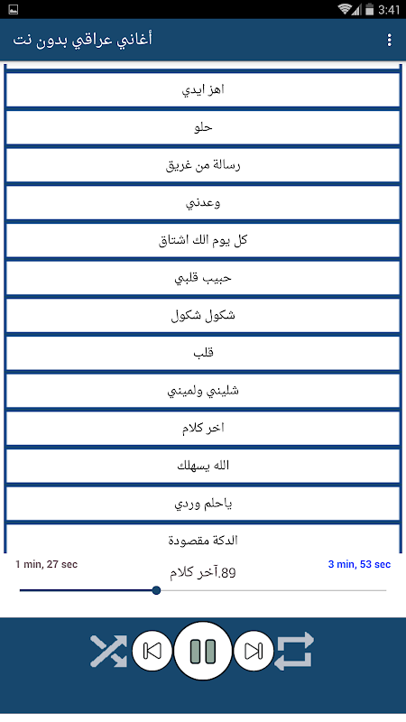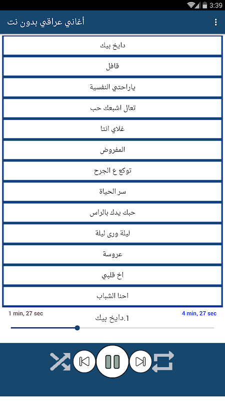Aplikasi ini memuat lagu-lagu Iraq yang paling indah sama sekali, menurut yang paling banyak dilihat dan diminta, dan tanpa Internet