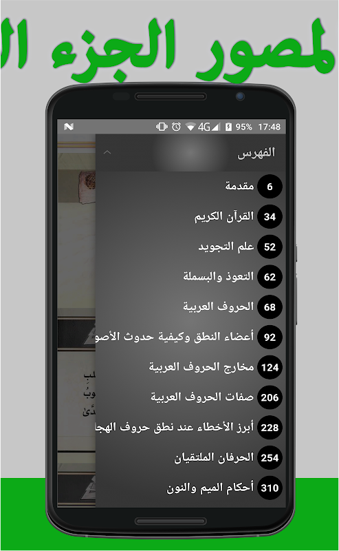 • بمجرد فتح قائمة التصفح في تطبيق التجويد المصور الجزء الأول يظهر لك الباب المفتوح حاليا بخلفية داكنة.