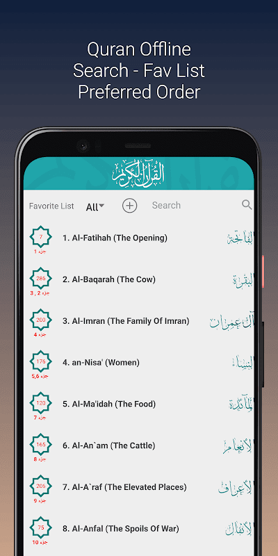 Dalam aplikasi android al quran ini anda akan menemui quran mp3, quran sharif que kami dengan nama surah al quran diterjemahkan ke bahasa Inggeris.