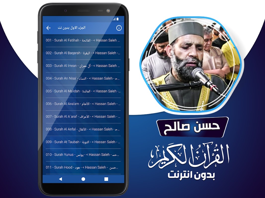 Application Aplikasi Al-Quran mengandungi suara pembaca Hassan Saleh, mendengarkan surah-surah Al-Quran tanpa internet dan dicirikan oleh aplikasi ini untuk membaca Al-Quran secara percuma.