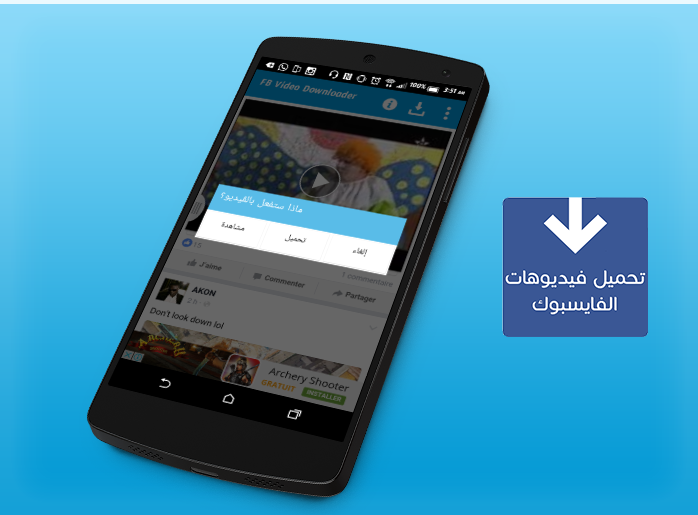 - تطبيق تحميل الفيديوهات من الفايسبوك بسرعة ومجانا ، يمكنك تحميل أي فيديو من الفيسبوك ومشاركته مع أصدقائك أورفعه مرة أخرى إلى الفيسبوك أو غيره من الشبكات الاجتماعية.