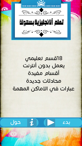 ولكن انا اعطيك برنامج كأنه قاموس انجليزي عربي يعلمك اللغة الانجليزية ولكن في برنامجي كل شيئ مختصر.. ان اعجبك لاتنسى ان تشاركه مع الاصدقاء ونحن نعلم الكثير يقول اريد تعلم الفرنسية بسهولة تعلم الالمانية بسهولة تعلم الاسبانية بسهولة تعلم الهندية بسهولة تعلم السويسرية بسهولة تعلم العبرية بسهولة والبعض يريد كورس تعليم الانجليزية كورس تعليم الفرنسية كورس تعليم الالمانية كورس تعليم الهندية كورس تعليم السويدية والبعض يريد تعليم الانجليزية للاطفال تعليم الفرنسية للاطفال تعليم اليابانية للاطفال تعليم التركية للاطفال تعليم الهندية للاطفال تعليم الاسبانية للاطفال تعليم اللغات بسرعه تعلم الاسبانية بسرعه تعلم الالمانية ولكن استطيع ان اقول لك ان تطبيقي يعلمك لغه جيدة تستخدمها في كل مكان مثل