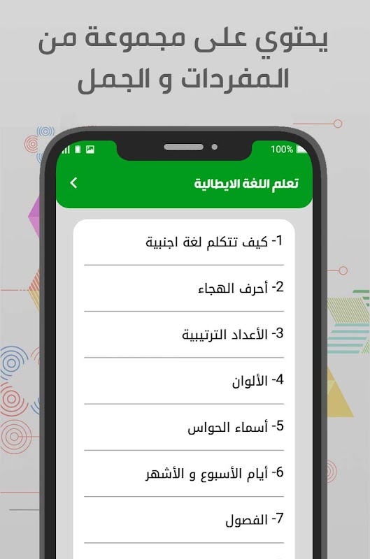 Aplikasi Belajar Bahasa Itali untuk Pemula membentangkan beberapa topik melalui pelajaran pendidikan untuk pemula yang membantu anda menggunakan tatabahasa Itali dan bercakap bahasa Itali dengan fasih.